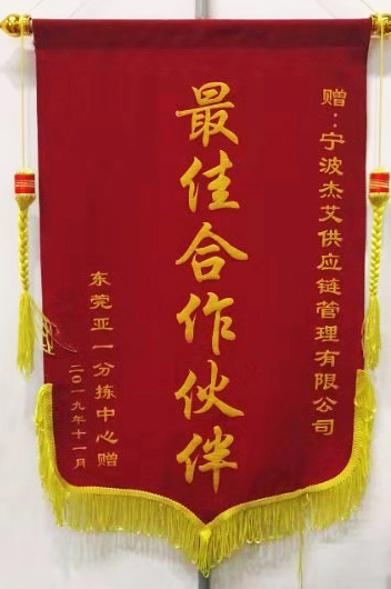 近日,杰艾集团旗下的宁波杰艾供应链管理有限公司,凭借专业的客户服务和良好的业务水平,获得了来自京东物流东莞亚一分拣中心的“最佳合作伙伴”荣誉称号,充分展现了京东物流对我们服务的高度认可与鼓励。杰艾集团也将继续不忘初心,砥砺前行,持续为客户提供更优质的服务。