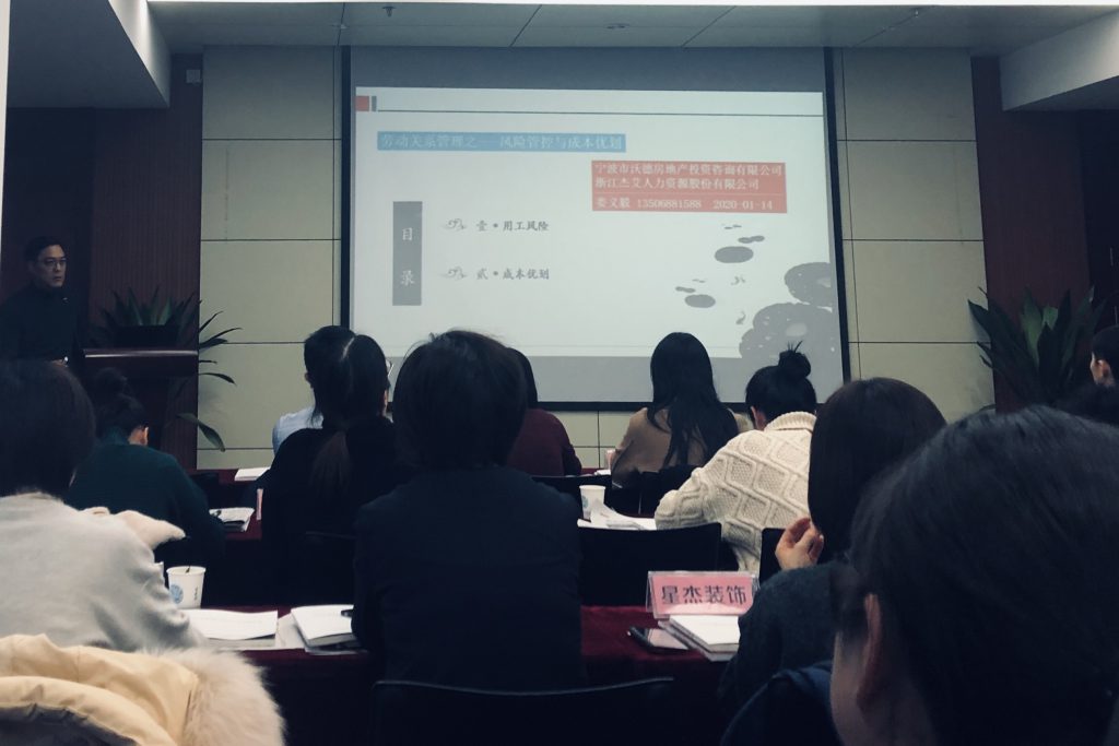 1月14日下午,由杰艾集团、宁波市侨商会及沃德房产主办的“我的写字楼邻居日——2020劳动用工风险管控与成本优化”主题分享会,在鄞州区南部商务区管委会、鄞州人社局和商务局的支持下,于宁波市南部商务区侨商大厦成功举办。