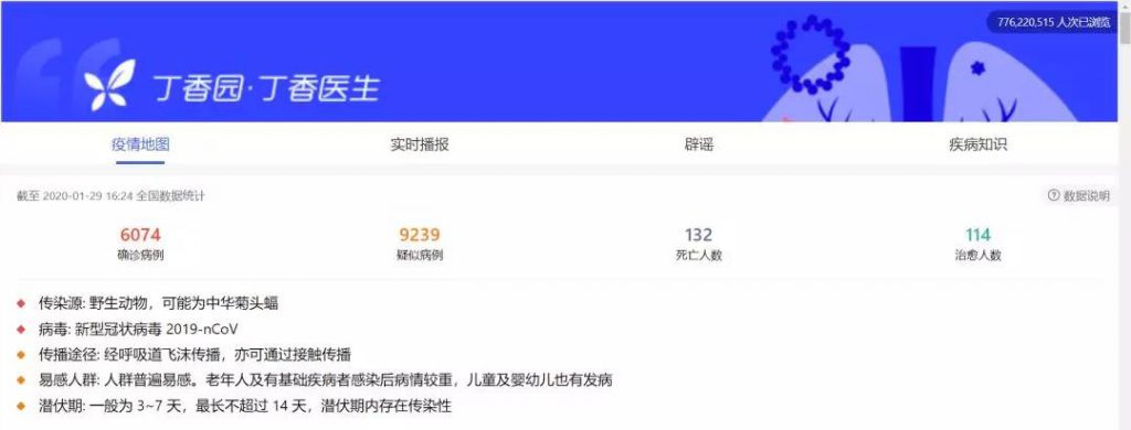 截止至2020年1月29日16:24,丁香园实时动态显示, 根据全国数据统计,因新型冠状病毒引发的肺炎,疑似病例超过9000例,确诊病例超过6000例。