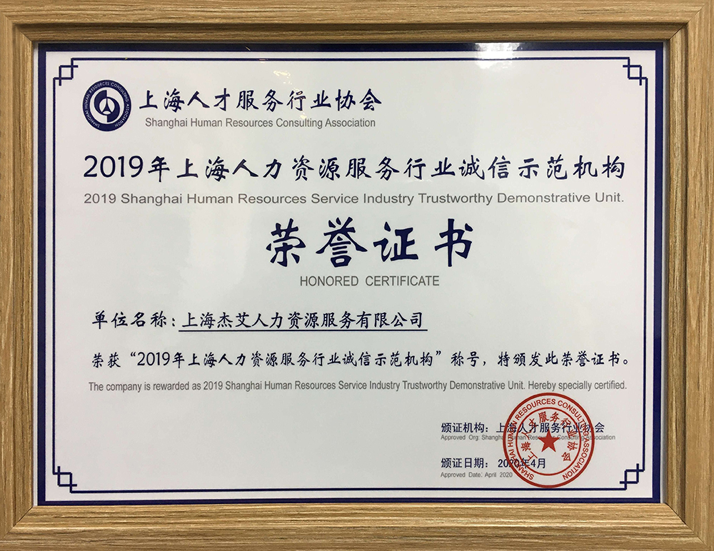 作为全球人力资源市场的重要参与者,杰艾集团不仅重视自身业务水平的发展和服务质量的提高,也始终关注着行业诚信体系的建设。杰艾集团将以高质量、高效率的人力资源服务坚持诚信经营,充分发挥诚信示范带动作用,推动人才交流,助力个人与企业的发展,为上海及全国人力资源服务事业积极贡献力量!