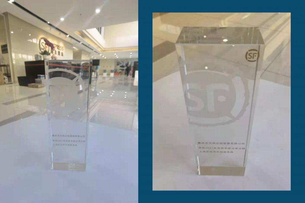 近日,杰艾控股旗下的嘉兴杰艾供应链管理有限公司,在顺丰物流对外部服务商年度综合评选的活动中,凭借专业的客户服务和良好的业务水平,从十几家外部服务商中脱颖而出,获得了“2021年度顺丰速运事业群上海区优秀外部服务商”的荣誉称号。 这是本次年度评选中唯一的外部服务商荣誉,充分展现了顺丰速运对我们服务的高度认可与鼓励。