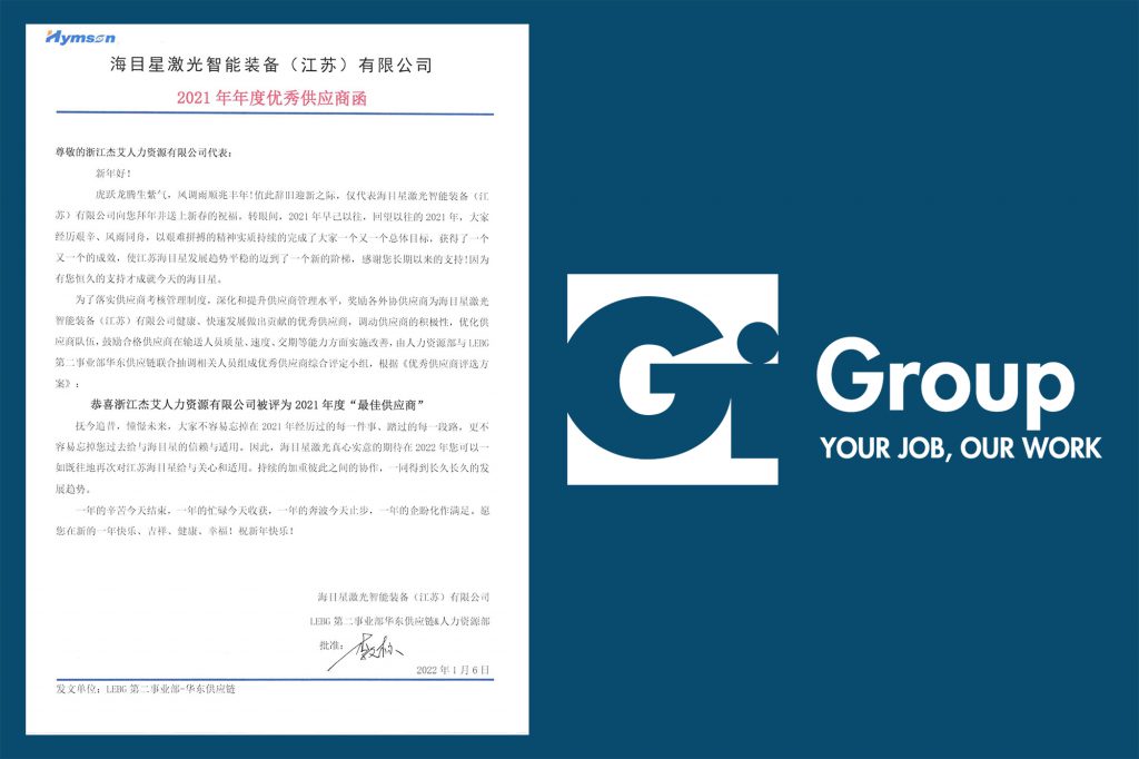 近日,杰艾控股凭借高质量的服务、高效率的交付,从众多供应商中脱颖而出,在海目星激光智能装备(江苏)有限公司的2021年年度优秀供应商评选活动中获得了“2021年度最佳供应商”荣誉称号。这是对杰艾控股过去一年工作成果的肯定,也是激励杰艾控股持续优化服务能力,进一步提升客户满意度的动力。